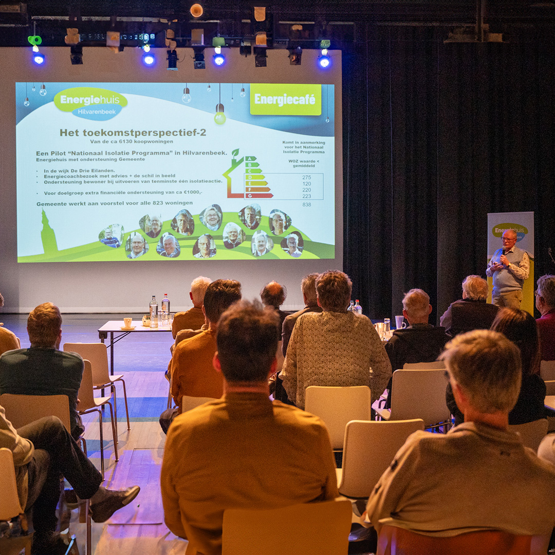 Energiehuis Hilvarenbeek organiseert regelmatig thema bijeenkomsten onder de naam Energiecafé voor de inwoners van de gemeente Hilvarenbeek. Voor deze bijeenkomsten nodigen zij deskundige sprekers uit die komen praten over onderwerpen zoals het verduurzamen van woningen en energiebesparing.